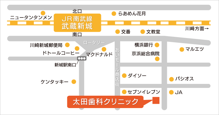 医院紹介クリニック名太田歯科クリニックTEL044-740-0071住所〒211-0044 神奈川県川崎市中原区新城1-11-3診療時間・休診日 月火水木金土日祝9:00~13:00●●●休●●休休14:30~18:00●●●休●●休休[休診日] 木曜・日曜・祝日アクセスJR南武線『武蔵新城駅』より徒歩5分駐車場なし (病院前に一台分の駐車スペースがありますので、前もって連絡いただければ駐車可能となっております。)